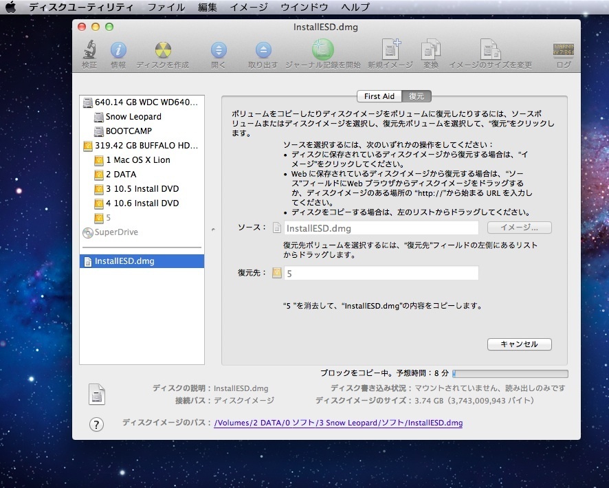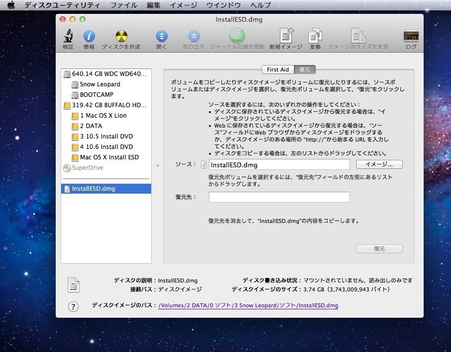 InstallESD.dmg(OS X Lionのインストールディスクのディスクイメージ)を保存してあるので、