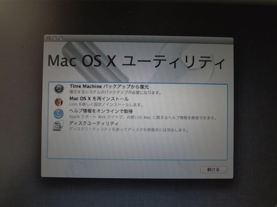 Lionのインストールメディア(InstallESD.dmgを復元した部分)から起動すると、