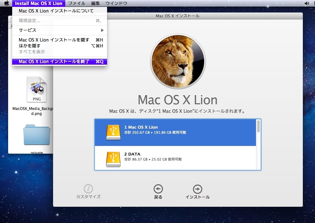 メニューバーの、Mac OS X Lion インストールを終了を選択。