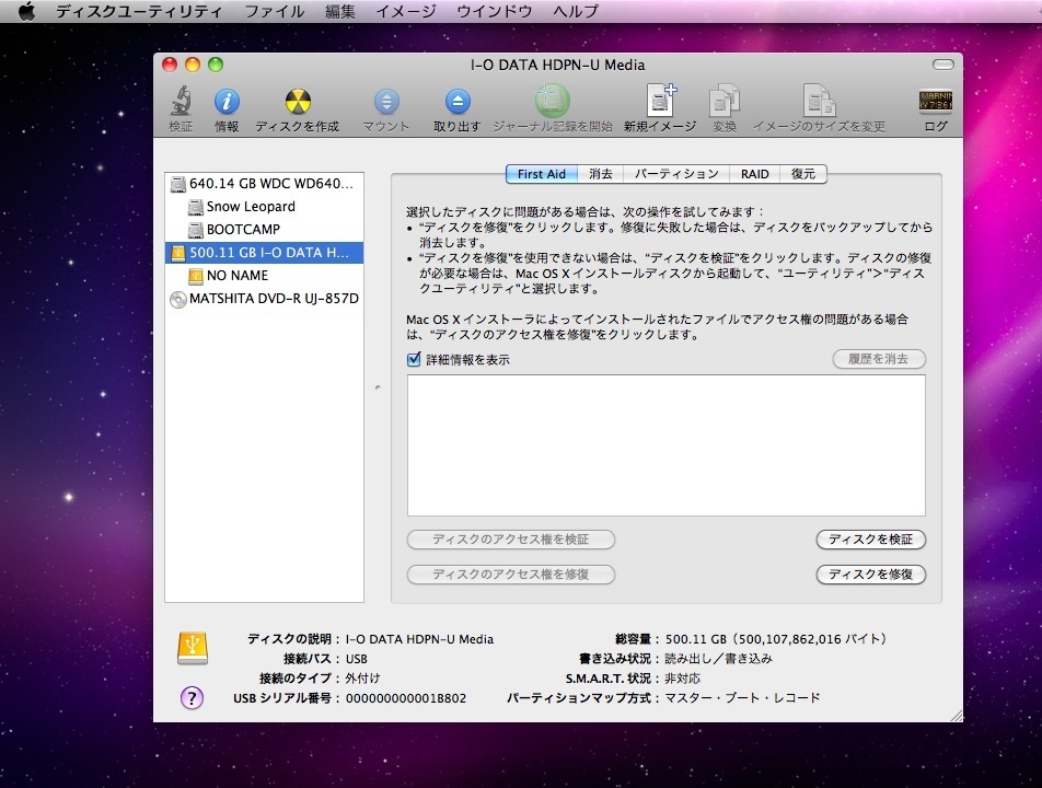 本体のSnow Leopardで起動して、ディスクユーティリティを開きます。