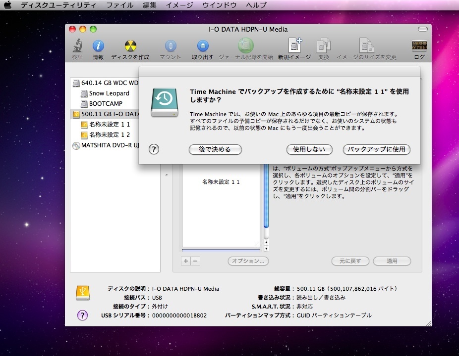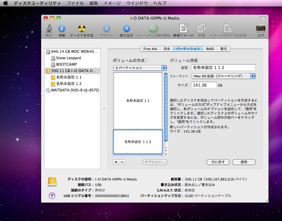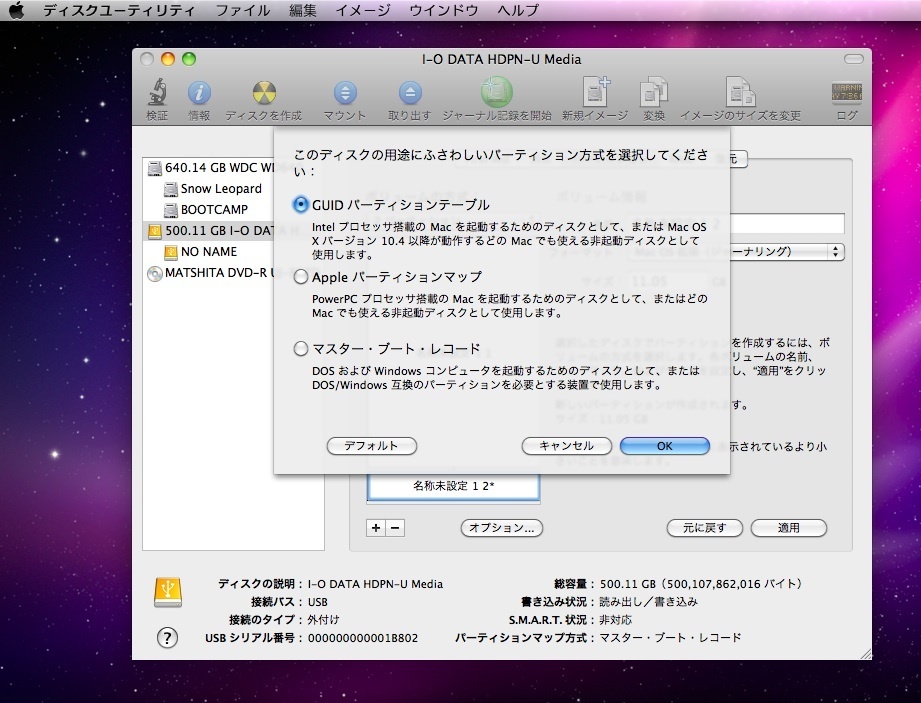 I-O DATAのHDを選んで、パーティションを切っていきます。