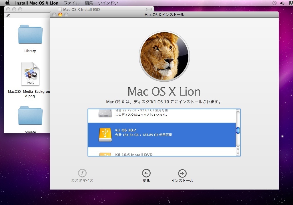 起動ディスク用に切ったパーティションに、Lionをインストールしてみます。