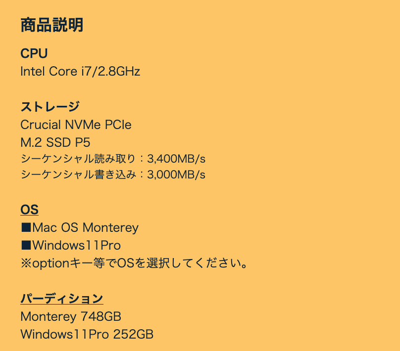 ブートキャンプで、Windows11Pro 252GB が入ってる仕様です。