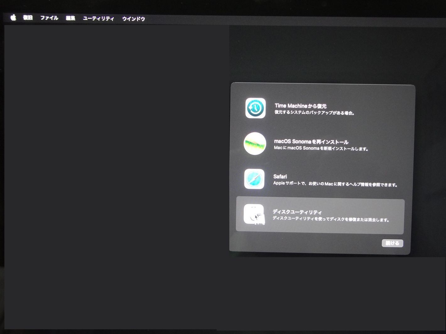 CommandキーとRキーを押しながら再起動。