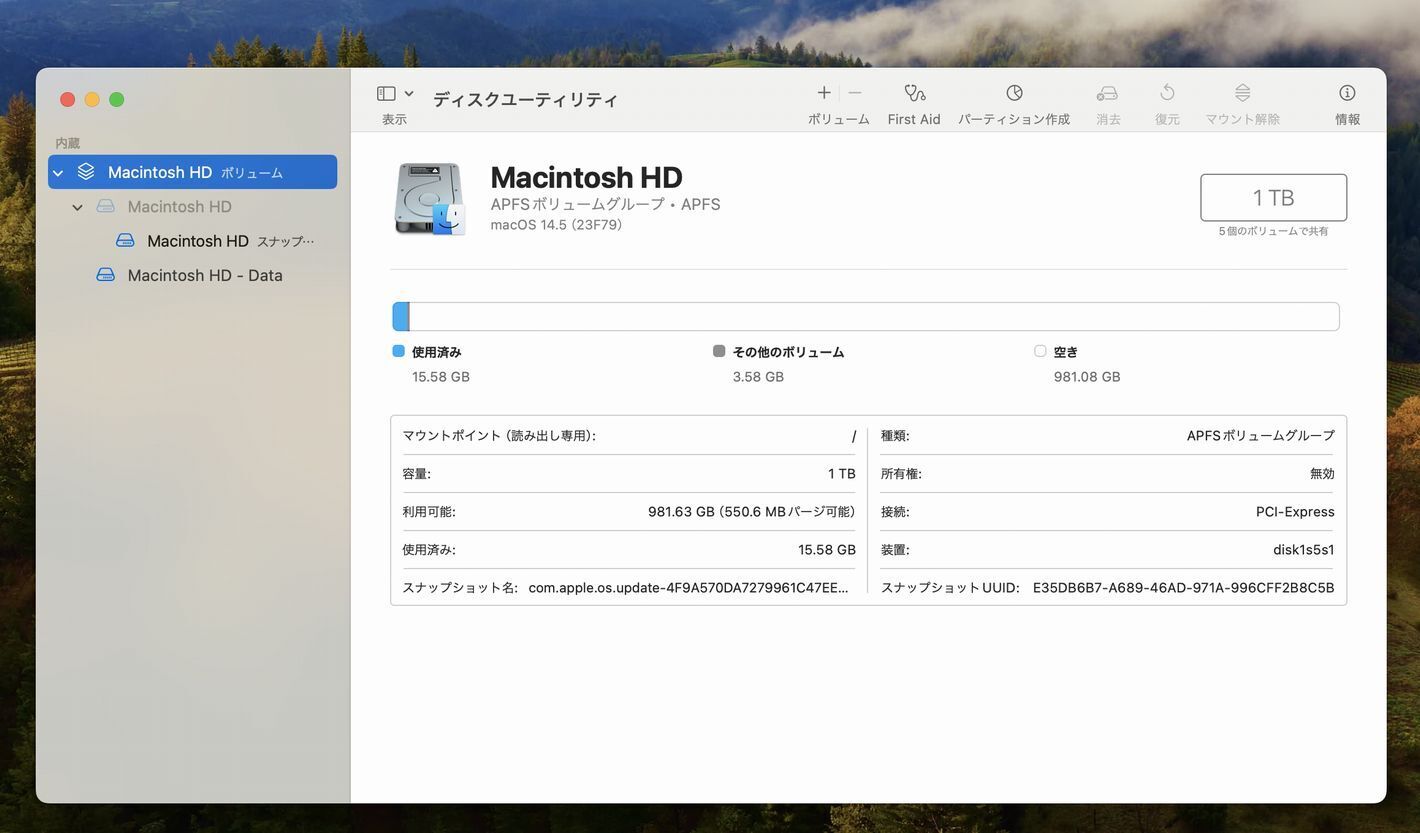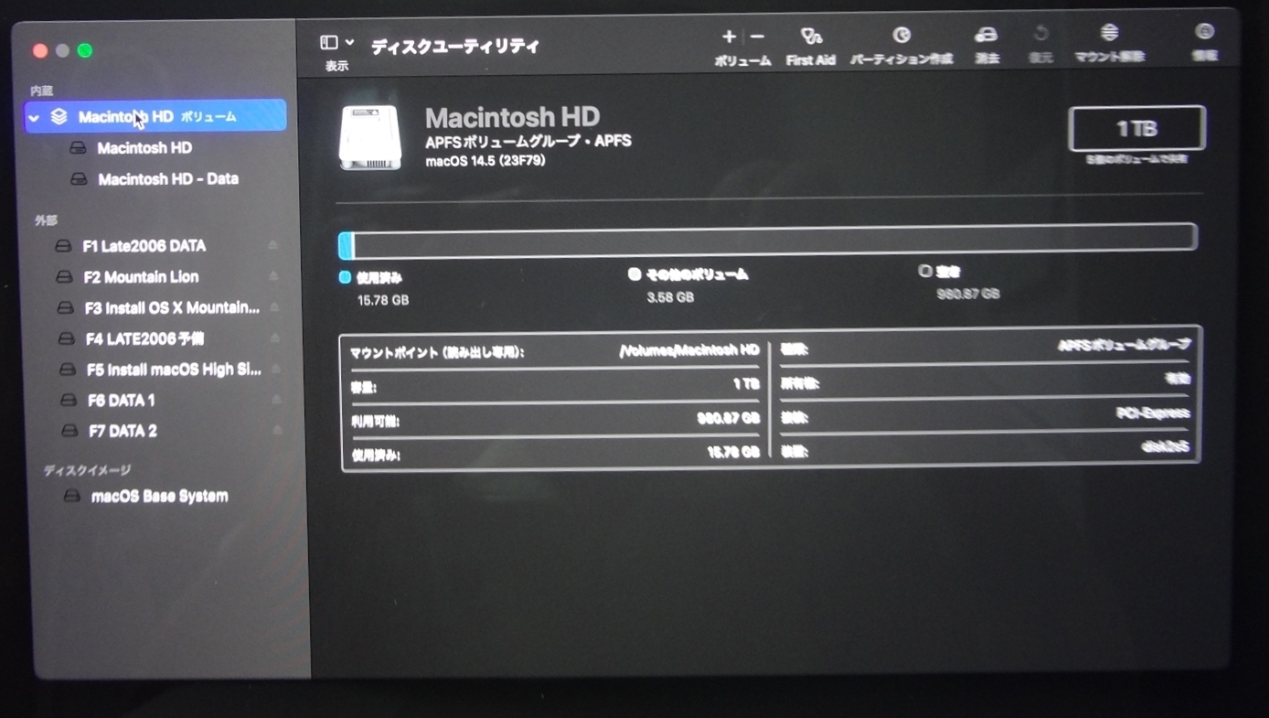 1TB APFS 使用済み15.58 GB