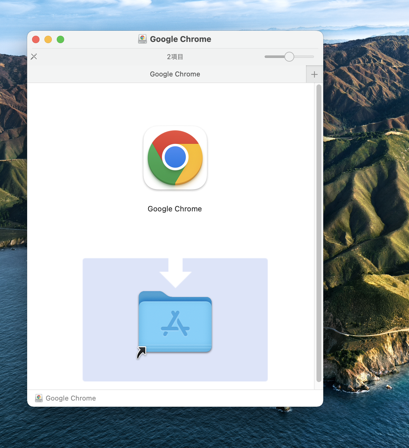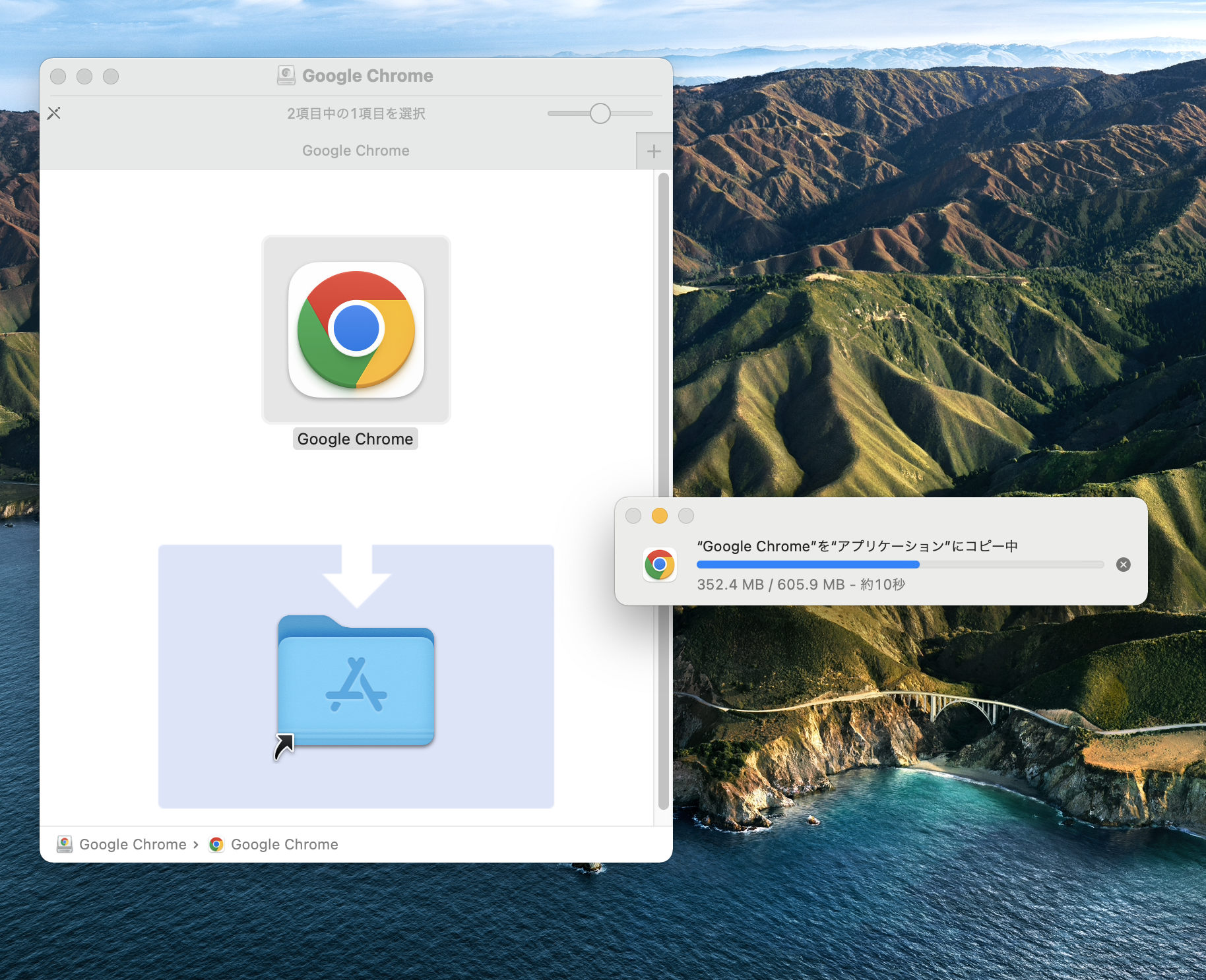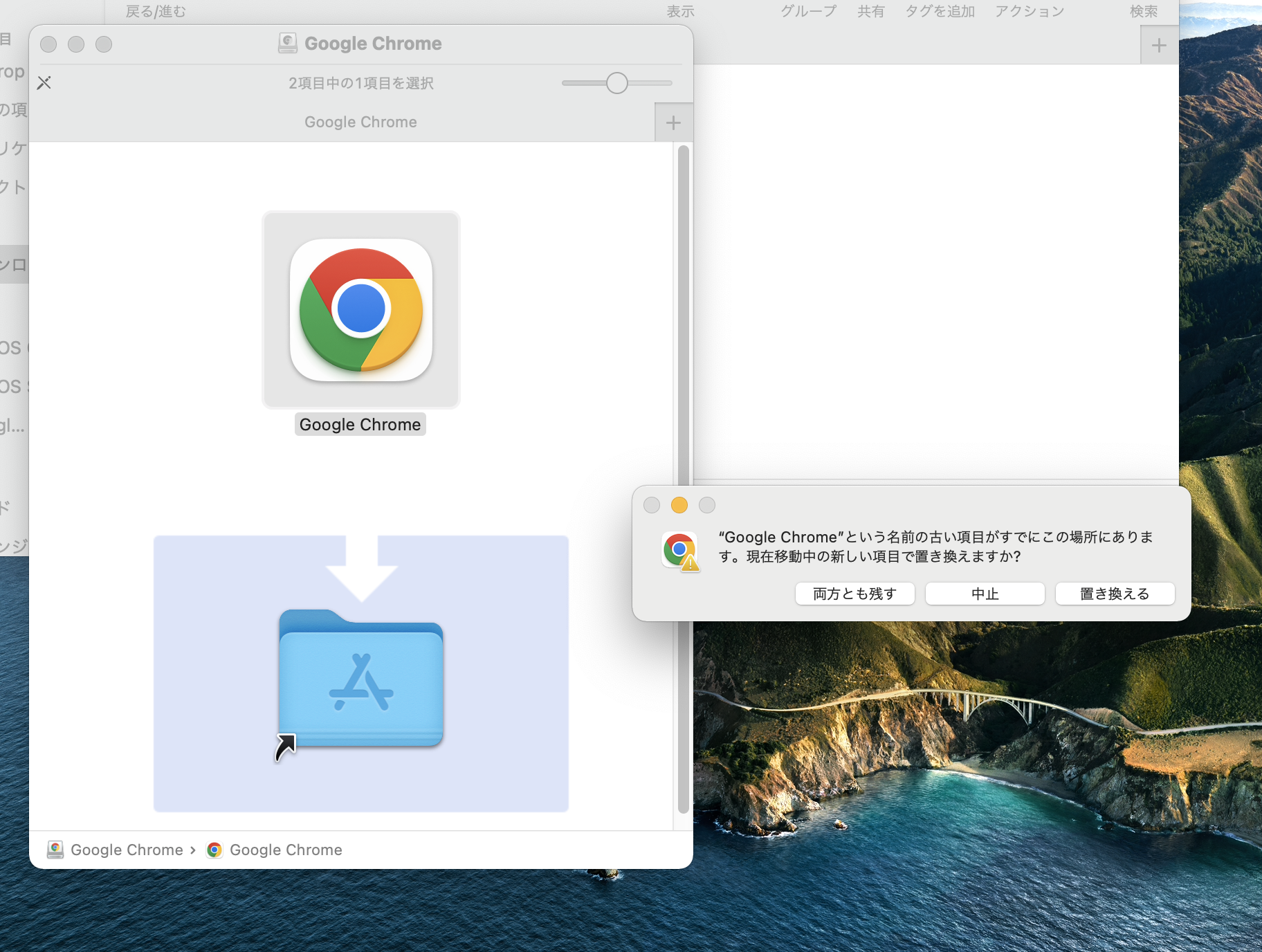Chrome 128.0.6613.85を、アプリケーションフォルダにドラッグ。