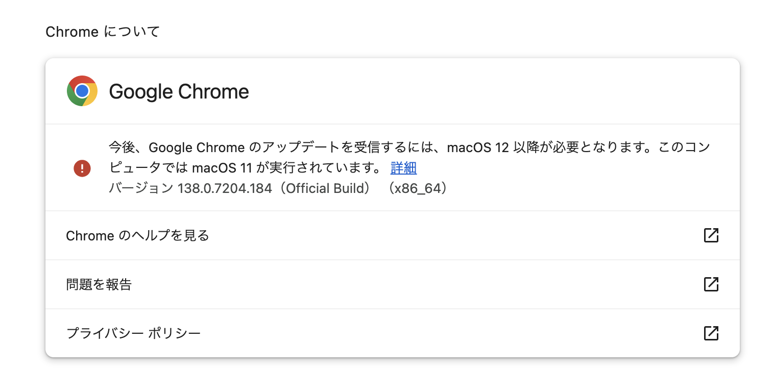 macOS 12 以降でないと、google chrome のアップデートできないみたい。