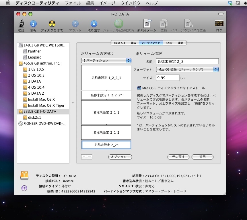 eMac 1.25GHzのOS X 10.5.8で起動して、ディスクユーティリティを開きます。